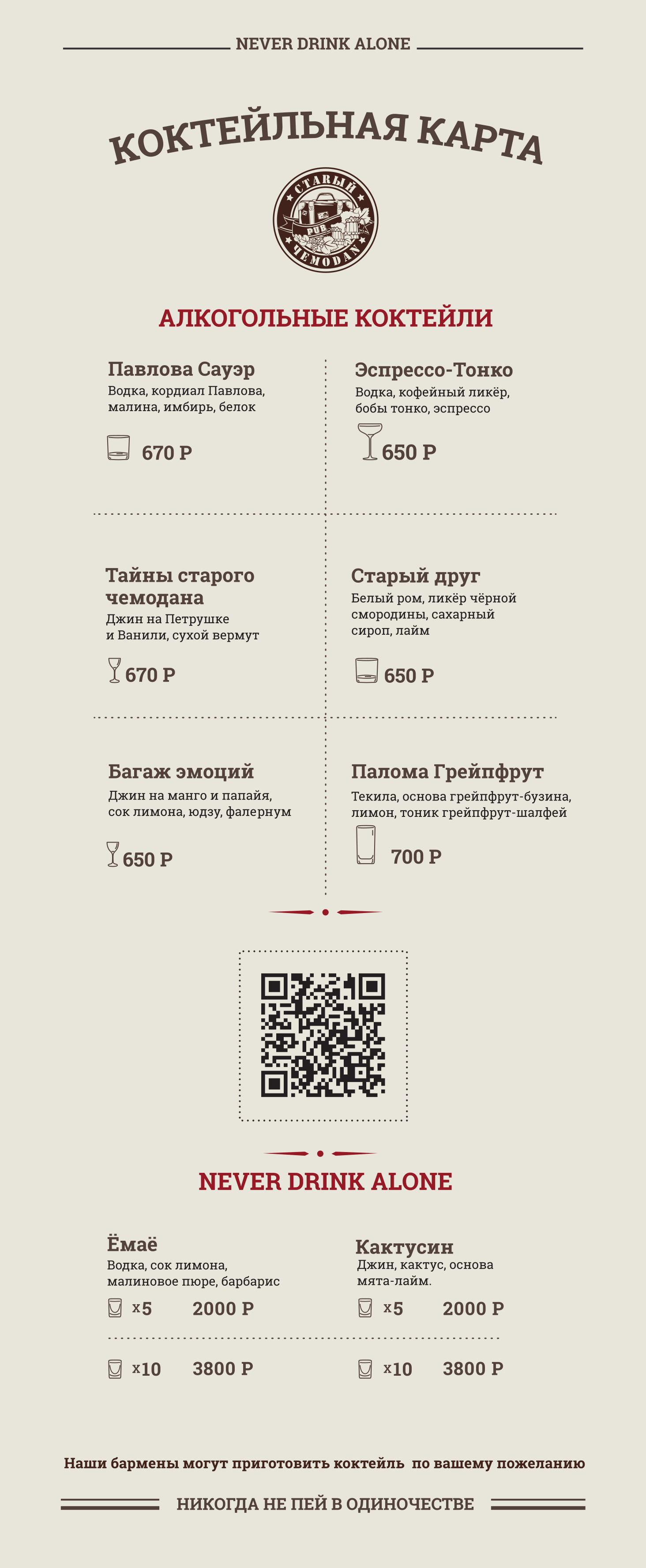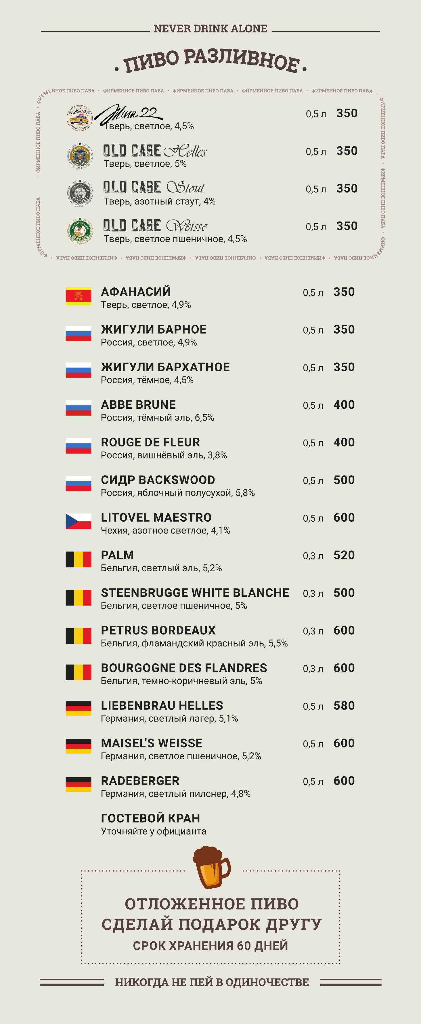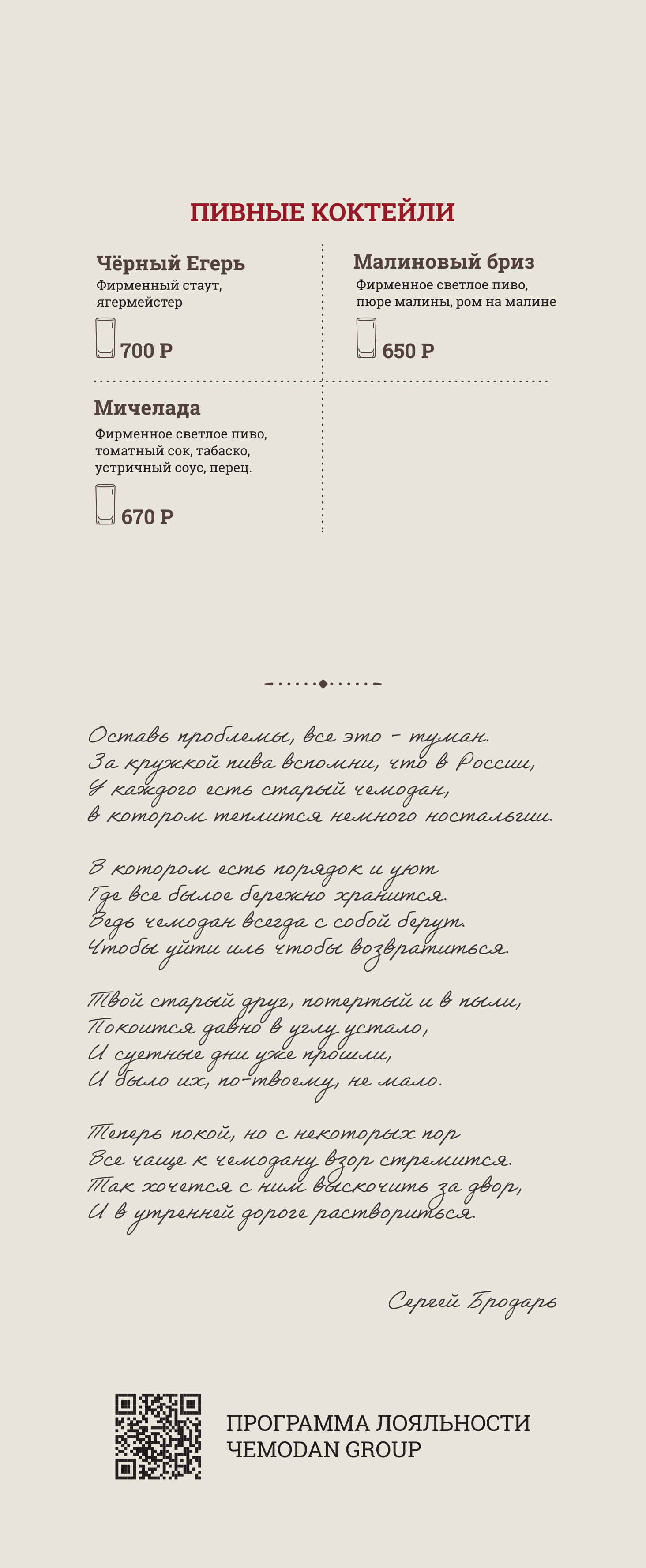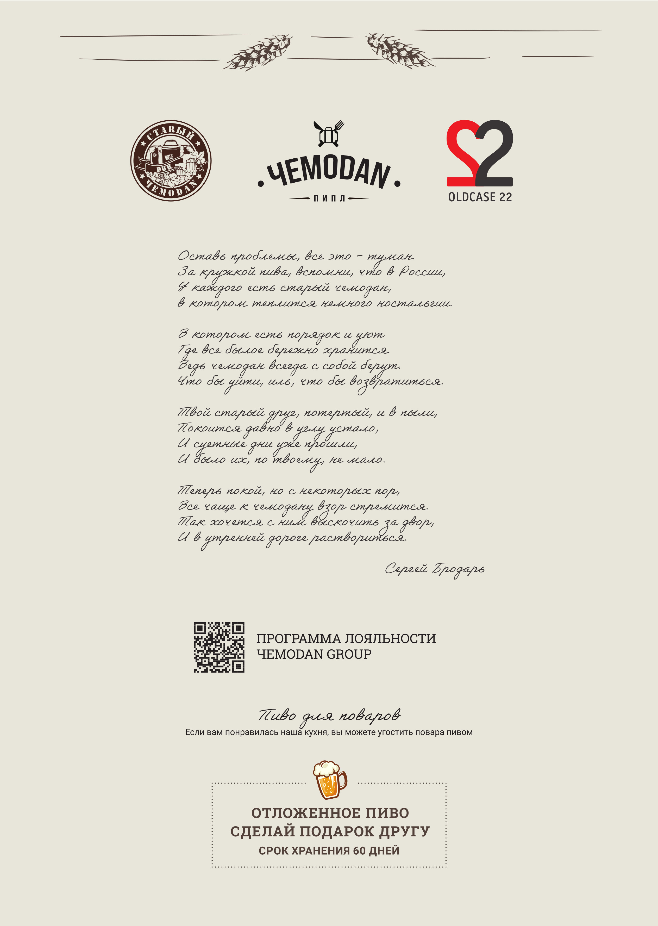 СТАRЫЙ ЧЕМОDАН - это уютное заведение в самом центре Твери, которое является не просто местом, где можно хорошо отдохнуть с друзьями, это место которое просто обязан посетить каждый, кто по-настоящему любит и ценит дружескую атмосферу, настоящую живую музыку, прямые трансляции главных спортивных событий, ну и несомненно отличную кухню и 14 сортов разливного пива.